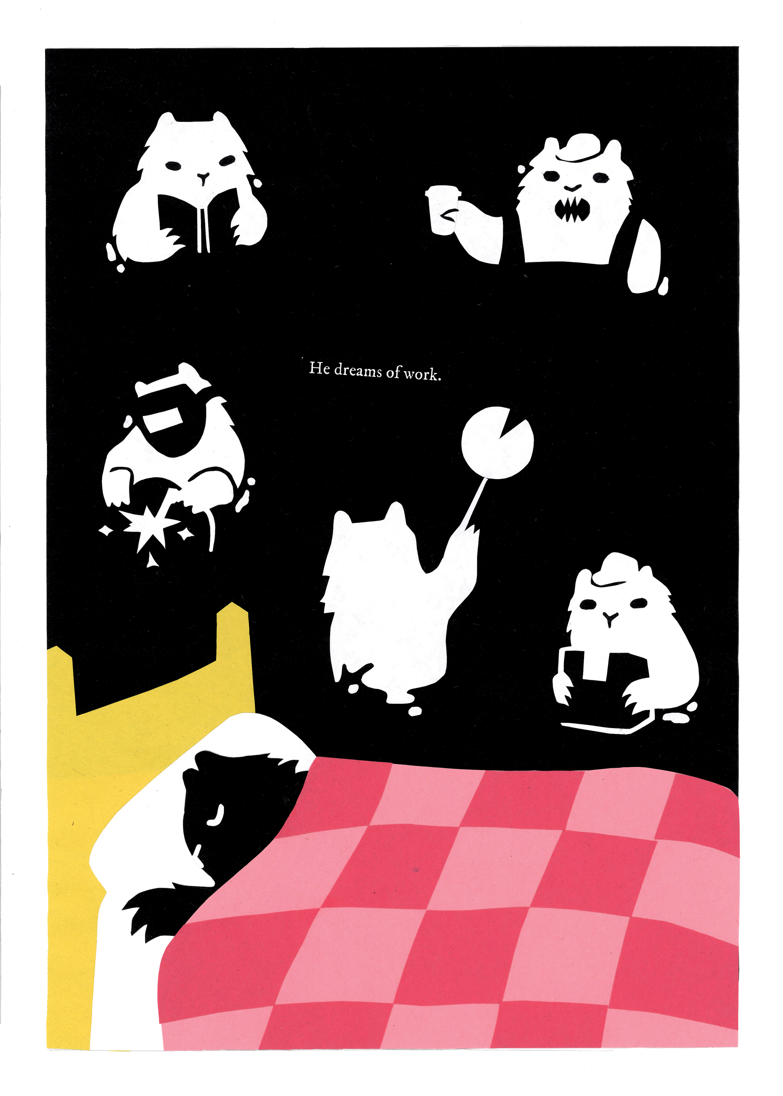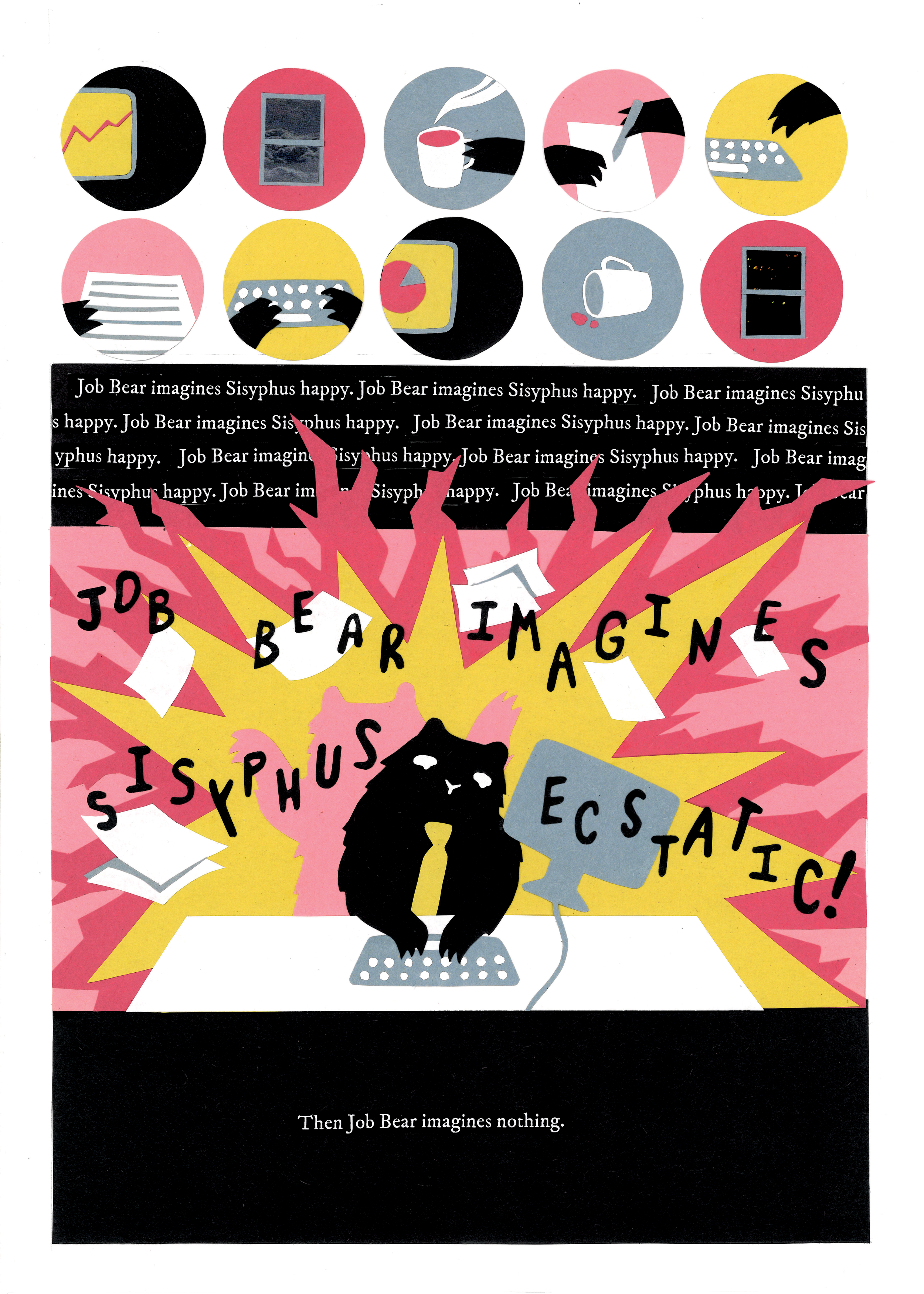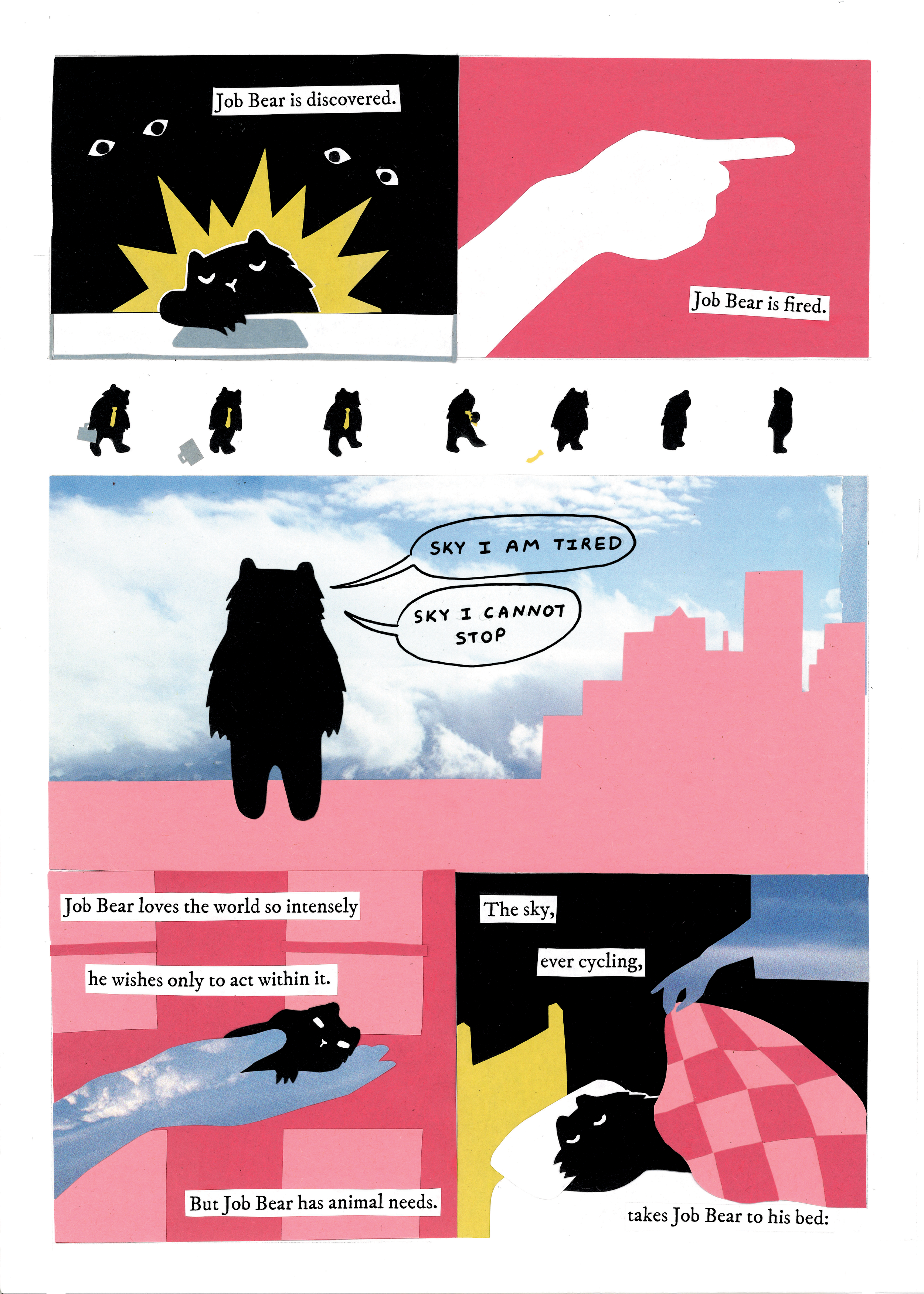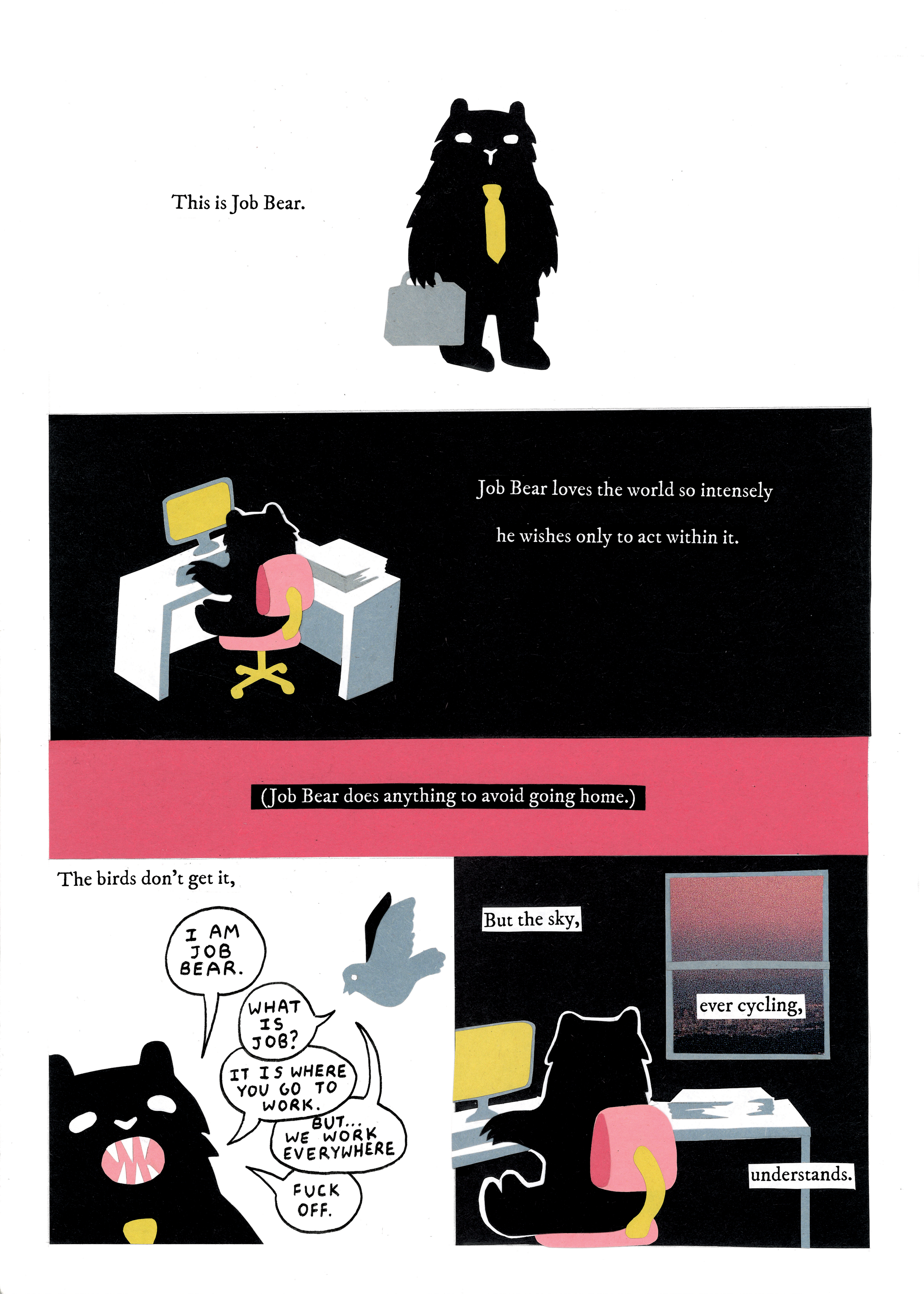 Made as part of Christopher Goblin’s Exhausted Bears Anthology. Cut paper on bristol, later risograph printed and sold by Goblin and Christopher themselves.